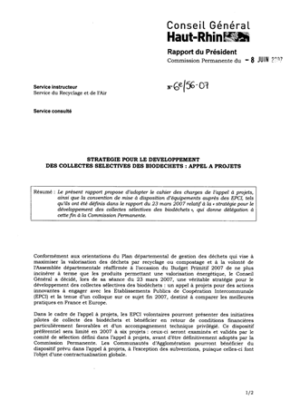 Le présent rapport propose d’adopter le cahier des charges de l’appel à projets, ainsi que la convention de mise à disposition d’équipements auprès des EPCI, tels qu’ils ont été définis dans le rapport du 23 mars 2007 relatif à la « stratégie pour le développement des collectes sélectives des biodéchets », qui donne délégation à cette fin à la Commission Permanente.