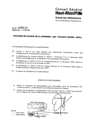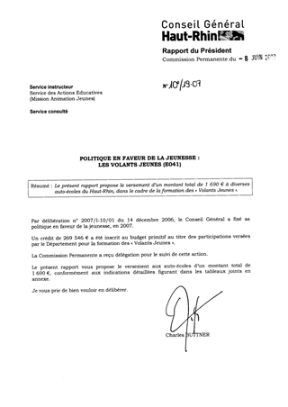 Le présent rapport propose le versement d’un montant total de 1 690 € à diverses auto-écoles du Haut-Rhin, dans le cadre de la formation des « Volants Jeunes"