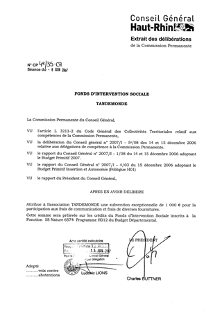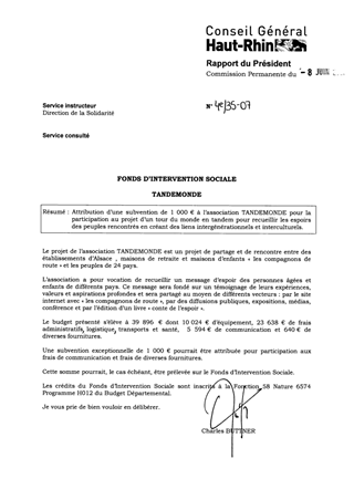 Attribution d’une subvention de 1 000 € à l’association TANDEMONDE pour la participation au projet d’un tour du monde en tandem pour recueillir les espoirs des peuples rencontrés en créant des liens intergénérationnels et interculturels.