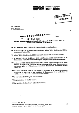 portant fixation des prix de journée hébergement et dépendance 2004 de l'EHPAD "La Roselière" de KUNHEIM. Resumé Pièces jointes ARRETE Assemblée : Non défini Date : 11/02/2004 Rapporteur : Non défini Collectivité : Conseil départemental du Haut-Rhin Direction : Non défini Service : Service de la Tarification des Etablissements Domaine : Prix de Journée Commission :
