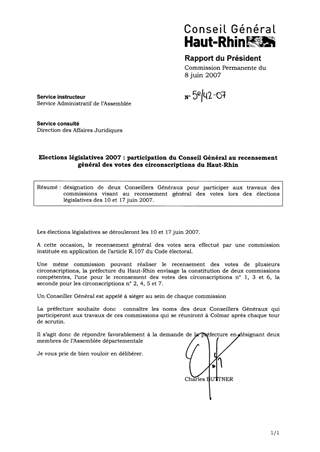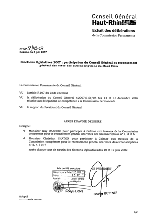 Elections législatives 2007. Participation du Conseil Général au recensement général des votes des circonscriptions du Haut-Rhin