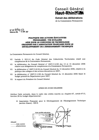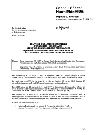 Dans le cadre du BP 2007, le Conseil Général a donné délégation à la Commission Permanente pour l’affectation des crédits liés à la vie scolaire. Le présent rapport concerne le concours scolaire local de technologie, pour lequel une aide de 500 € est proposée.