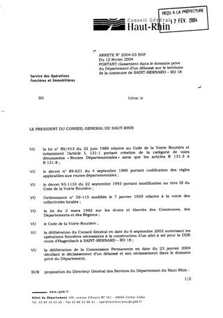 portant classement dans le domaine privé du Département d'un délaissé sur le territoire de la commune de SAINT-BERNARD - RD 18. Resumé Pièces jointes ARRETE Assemblée : Non défini Date : 12/02/2004 Rapporteur : Non défini Collectivité : Conseil départemental du Haut-Rhin Direction : Non défini Service : Service du Patrimoine et du droit des Sols Domaine : Autres (non classés) Commission :