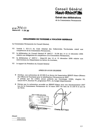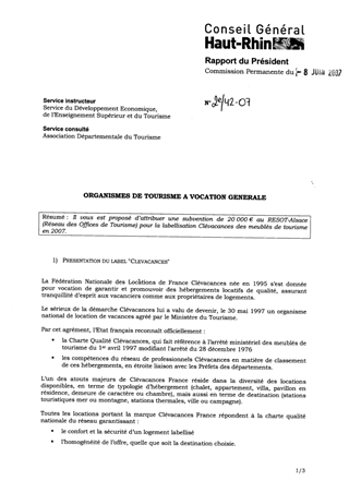 Il vous est proposé d’attribuer une subvention de 20 000 € au RESOT-Alsace (Réseau des Offices de Tourisme) pour la labellisation Clévacances des meublés de tourisme en 2007.