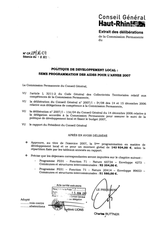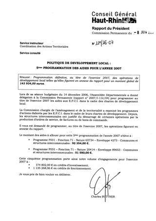 Programmation définitive, au titre de l’exercice 2007, des opérations de développement local telles qu’elles figurent en annexe du rapport pour un montant global de 143 934,00 euros.