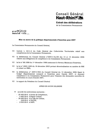 L’Assemblée Départementale, lors du vote du BP 2007 s’est prononcée pour l’inscription d’un crédit de 4 849 125 € afin de soutenir les organismes d’insertion et a délégué à la Commission Permanente l’examen des demandes de contributions financières nécessaires à la mise en œuvre d’actions spécifiques à destination de l’insertion des bénéficiaires du RMI. L'examen des projets formulés dans le cadre de la politique d’insertion développée en 2007, s’effectue sur la base de la lettre de mission qui a été adressée à l’ensemble des organismes intervenant en matière d’accompagnement social et professionnel, dans le champ de l’insertion par l’activité économique, ainsi qu’en matière d’accueil et d’aide d’urgence. L’ action proposée par Action & Compétence pour bénéficier des financements sur les crédits d’insertion, répond au cadrage de la lettre de mission. Le Conseil Général attribue également des aides à l’équipement, dans le cadre des crédits dédiés à l’insertion, aux structures qui accueillent des bénéficiaires du RMI. L’association Espoir à Colmar a déposé une demande de soutien à cette fin. Il est proposé d’autoriser le Président à signer la convention 2007 avec Action & Compétence ainsi que l’avenant n°3 à la convention portant partenariat dans le cadre du RMI, avec l’association Espoir à Colmar. Il y a également lieu d’affecter 30 000 € à la Ville de Colmar qui assure le fonctionnement du secrétariat de la Commission Locale d’Insertion (CLI), des 64 000 € votés lors du BP et destinés à prendre en charge le fonctionnement des secrétariats des CLI de Colmar et de la couronne mulhousienne. L’Assemblée Départementale a aussi voté un crédit de 61 000 € pour permettre la mise en œuvre de projets locaux d'insertion. Dans ce cadre, les CLI de St Louis-Altkirch et Guebwiller présentent des projets pour un coût total de 2 303 €. Le montant total des subventions proposées s’élève à : 57 686.50 €.