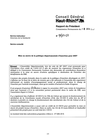 Mise en oeuvre de la politique départementale d'insertion pour 2007