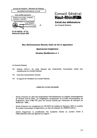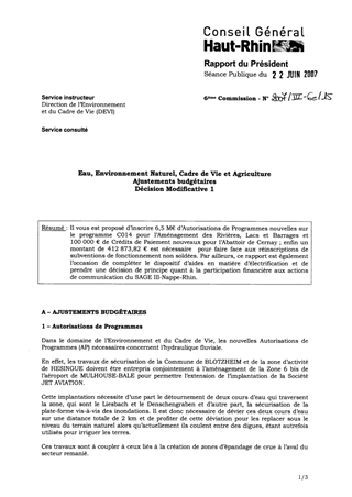 Il vous est proposé d’inscrire 6,5 M€ d’Autorisations de Programmes nouvelles sur le programme C014 pour l’Aménagement des Rivières, Lacs et Barrages et 100 000 € de Crédits de Paiement nouveaux pour l’Abattoir de Cernay ; enfin un montant de 412 873,82 € est nécessaire pour faire face aux réinscriptions de subventions de fonctionnement non soldées. Par ailleurs, ce rapport est également l’occasion de compléter le dispositif d’aides en matière d’électrification et de prendre une décision de principe quant à la participation financière aux actions de communication du SAGE Ill-Nappe-Rhin.