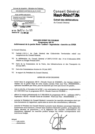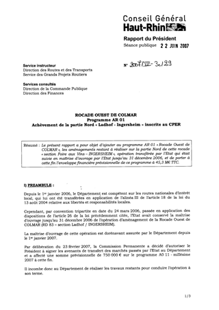 Le présent rapport a pour objet d’ajouter au programme AR 01 « Rocade Ouest de COLMAR », les aménagements restant à réaliser sur la partie Nord de cette rocade « section Foire aux Vins – INGERSHEIM », opération transférée par l’Etat qui était suivie en maîtrise d’ouvrage par l’Etat jusqu’au 31 décembre 2006, et de porter à cette fin l’enveloppe financière prévisionnelle de ce programme à 45,3 M€ TTC.