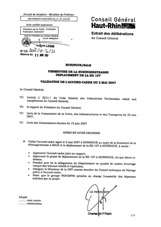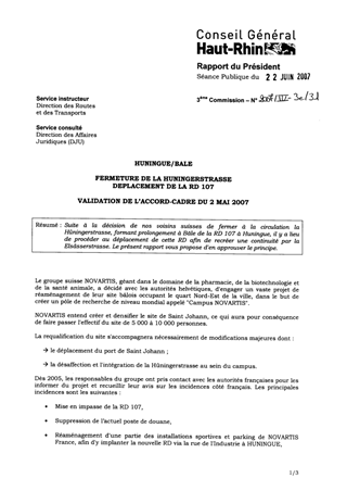 Huningue Bâle : fermeture de la Huningerstrasse - Déplacement de la RD 107 - Validation de l'accord-cadre du 2 Mai 2007