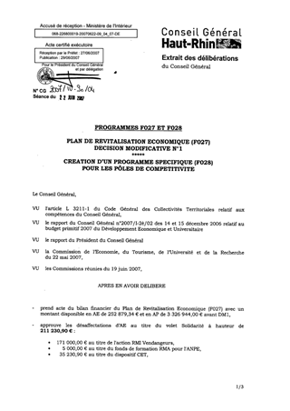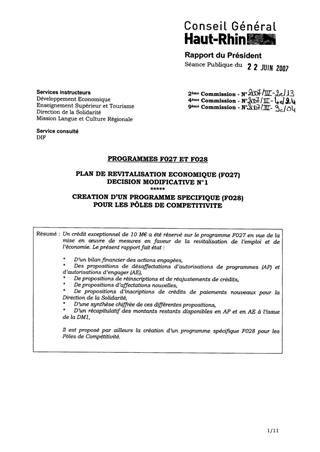 Un crédit exceptionnel de 10 M€ a été réservé sur le programme F027 en vue de la mise en œuvre de mesures en faveur de la revitalisation de l’emploi et de l’économie. Le présent rapport fait état : * D’un bilan financier des actions engagées, * Des propositions de désaffectations d’autorisations de programmes (AP) et d’autorisations d’engager (AE), * De propositions de réinscriptions et de réajustements de crédits, * De propositions d’affectations nouvelles, * De propositions d’inscriptions de crédits de paiements nouveaux pour la Direction de la Solidarité, * D’une synthèse chiffrée de ces différentes propositions, * D’un récapitulatif des montants restants disponibles en AP et en AE à l’issue de la DM1, Il est proposé par ailleurs la création d’un programme spécifique F028 pour les Pôles de Compétitivité.