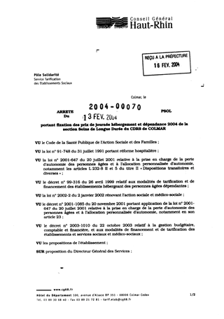 portant fixation des prix de journée hébergement et dépendance 2004 de la section soins de longue durée du CDRS de COLMAR. Resumé Pièces jointes ARRETE Assemblée : Non défini Date : 13/02/2004 Rapporteur : Non défini Collectivité : Conseil départemental du Haut-Rhin Direction : Non défini Service : Service de la Tarification des Etablissements Domaine : Prix de Journée Commission :
