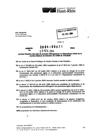 portant fixation des prix de journée hébergement et dépendance 2004 de la section maison de retraite du CDRS de COLMAR. Resumé Pièces jointes ARRETE Assemblée : Non défini Date : 13/02/2004 Rapporteur : Non défini Collectivité : Conseil départemental du Haut-Rhin Direction : Non défini Service : Service de la Tarification des Etablissements Domaine : Prix de Journée Commission :