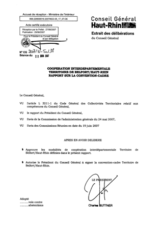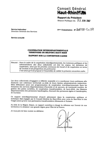 Coopération interdépartementale avec le Territoire de Belfort / Haut-Rhin. Rapport sur la convention-cadre