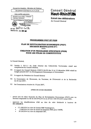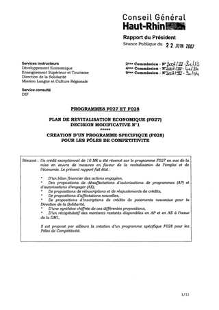 Un crédit exceptionnel de 10 M€ a été réservé sur le programme F027 en vue de la mise en œuvre de mesures en faveur de la revitalisation de l’emploi et de l’économie. Le présent rapport fait état : * D’un bilan financier des actions engagées, * Des propositions de désaffectations d’autorisations de programmes (AP) et d’autorisations d’engager (AE), * De propositions de réinscriptions et de réajustements de crédits, * De propositions d’affectations nouvelles, * De propositions d’inscriptions de crédits de paiements nouveaux pour la Direction de la Solidarité, * D’une synthèse chiffrée de ces différentes propositions, * D’un récapitulatif des montants restants disponibles en AP et en AE à l’issue de la DM1, Il est proposé par ailleurs la création d’un programme spécifique F028 pour les Pôles de Compétitivité.
