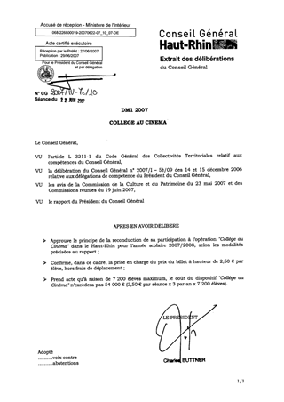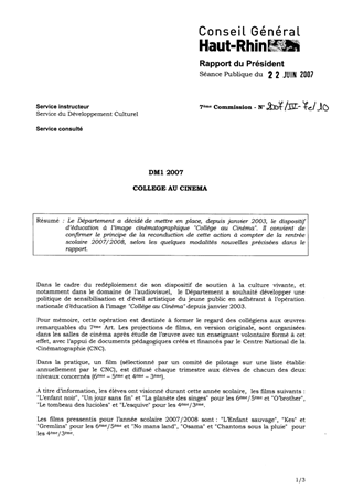 Le Département a décidé de mettre en place, depuis janvier 2003, le dispositif d’éducation à l’image cinématographique "Collège au Cinéma". Il convient de confirmer le principe de la reconduction de cette action à compter de la rentrée scolaire 2007/2008, selon les quelques modalités nouvelles précisées dans le rapport.
