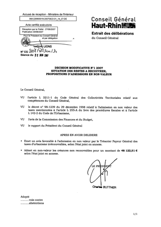 Le Payeur départemental a établi un état des titres de recettes restant à recouvrer à la clôture de l’exercice 2006. Au vu des dossiers et des requêtes effectuées, il vous demande de délibérer sur l’admission en non valeur de certaines de ces créances jugées irrécouvrables en 2006. Ces demandes d’admission portent sur un montant de 48 122,51 €. En outre, le Département a été saisi par le Trésorier Payeur Général du Haut-Rhin sur l’admission en non valeur de taxes d’urbanisme, d’un montant de 490,96€, qui s’avèrent irrécouvrables. Ces admissions ne font pas l’objet d’une inscription au budget.