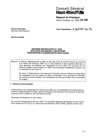 Décision Modificative n° 1 - 2007 : situation des restes à recouvrer : propositions d'admissions en non-valeur