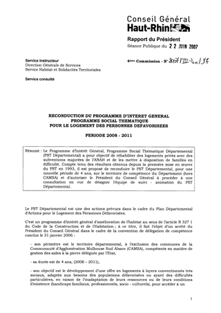 Le Programme d’Intérêt Général, Programme Social Thématique Départemental (PST Départemental) a pour objectif de réhabiliter des logements privés avec des subventions majorées de l’ANAH et de les mettre à disposition de familles en difficulté. Compte tenu des résultats obtenus depuis la première mise en œuvre du PST en 1993, il est proposé de reconduire le PST Départemental, pour une nouvelle période de 4 ans, sur le territoire de compétence du Département (hors CAMSA) et d’autoriser le Président du Conseil Général à procéder à une consultation en vue de désigner l’équipe de suivi - animation du PST Départemental.