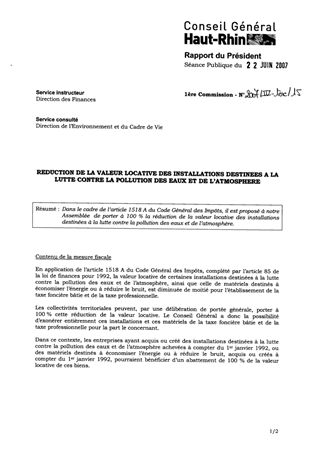 Dans le cadre de l’article 1518 A du Code Général des Impôts, il est proposé à notre Assemblée de porter à 100 % la réduction de la valeur locative des installations destinées à la lutte contre la pollution des eaux et de l’atmosphère.