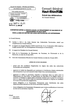 Convention entre la Région Alsace, le Département du Bas-Rhin et la Département du Haut-Rhin pour la mise en œuvre des aides individuelles aux entreprises