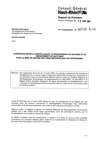 En application de la loi du 13 août 2004 qui précise notamment les conditions d’application du nouveau régime d’aides des collectivités locales aux entreprises et en cohérence avec les orientations définies dans le cadre du Schéma Régional de Développement Economique, les Départements du Haut-Rhin, du Bas–Rhin et la Région Alsace décident d’apporter de façon partenariale et complémentaire, leur concours au développement des entreprises dans le cadre d’une convention jointe au présent rapport.
