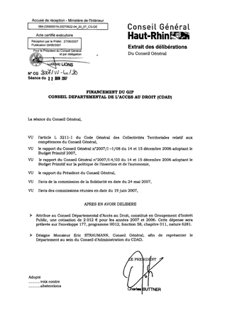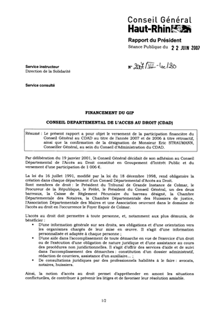 Le présent rapport a pour objet le versement de la participation financière du Conseil Général au CDAD au titre de l’année 2007 et de 2006 à titre rétroactif, ainsi que la confirmation de la désignation de Monsieur Eric STRAUMANN, Conseiller Général, au sein du Conseil d’Administration du CDAD.