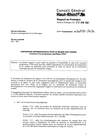 Le présent rapport a pour objet de proposer à l’Assemblée le vote d’un nouveau programme F 043 ainsi que des crédits nécessaires en autorisation de programme et en crédits de paiement pour permettre la mise en œuvre de la convention interrégionale pour le massif des Vosges.