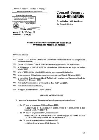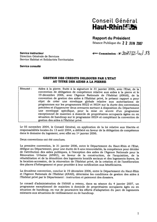 Aides à la pierre. Suite à la signature le 31 janvier 2006, avec l’Etat, de la convention de délégation de compétence relative aux aides à la pierre et le 19 décembre 2006, avec l’Agence Nationale de l’Habitat (ANAH), de la convention de gestion des aides à l’Habitat privé, le présent rapport a pour objet de créer une enveloppe globale relative aux autorisations de programmes sur les programmes H022 et H024 sur la durée des conventions précitées et d’approuver deux avenants mettant à disposition du Département une enveloppe spécifique, pour la mise en œuvre d’un programme exceptionnel de maintien à domicile de propriétaires occupants âgées ou en situation de handicap sur le programme H024 et complétant la convention de gestion des aides à l’Habitat privé.