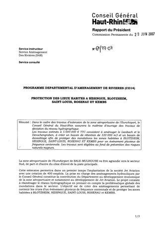 Dans le cadre des travaux d’extension de la zone aéroportuaire de l’EuroAirport, le Conseil Général du Haut-Rhin assurera la maîtrise d’ouvrage des travaux de déviation du réseau hydrographique. Les travaux estimés à 5 000 000 € TTC consistent à aménager le Liesbach et le Denschengraben, à créer un bassin de rétention de 330 000 m3 et un bassin de dessablage afin de protéger des inondations les zones habitées à BLOTZHEIM, HESINGUE, SAINT-LOUIS, ROSENAU ET KEMBS pour un évènement pluvieux de fréquence centennale. Les travaux sont éligibles au fond de prévention des risques naturels majeurs.