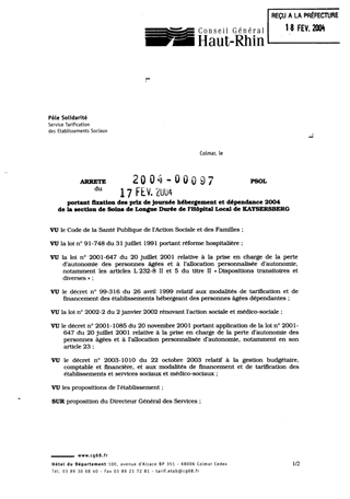portant fixation des prix de journée hébergement et dépendance 2004 de la section de soins longue durée de l'hôpital local de KAYSERSBERG. Resumé Pièces jointes ARRETE Assemblée : Non défini Date : 17/02/2004 Rapporteur : Non défini Collectivité : Conseil départemental du Haut-Rhin Direction : Non défini Service : Service de la Tarification des Etablissements Domaine : Prix de Journée Commission :