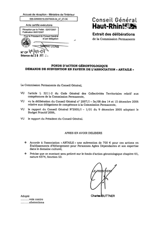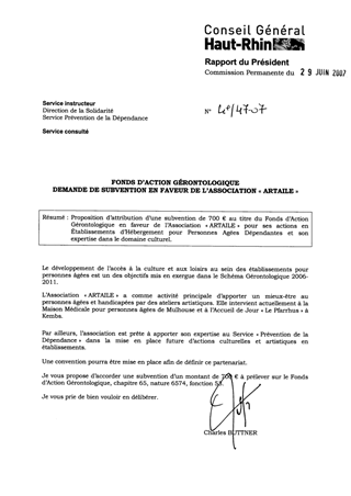 Fonds d'action gérontologique. Demande de subvention en faveur de l'association "Artaile"