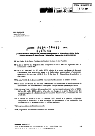 portant fixation des prix de journée hébergement et dépendance 2004 de la section maison de retraite de l'hôpital du Hasenrain de MULHOUSE. Resumé Pièces jointes ARRETE Assemblée : Non défini Date : 17/02/2004 Rapporteur : Non défini Collectivité : Conseil départemental du Haut-Rhin Direction : Non défini Service : Service de la Tarification des Etablissements Domaine : Prix de Journée Commission :
