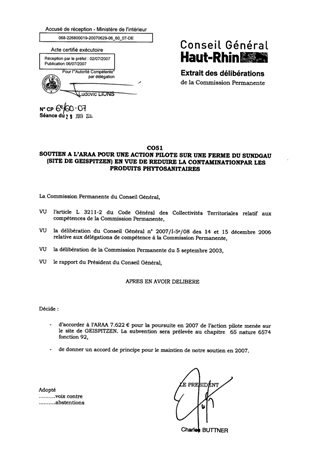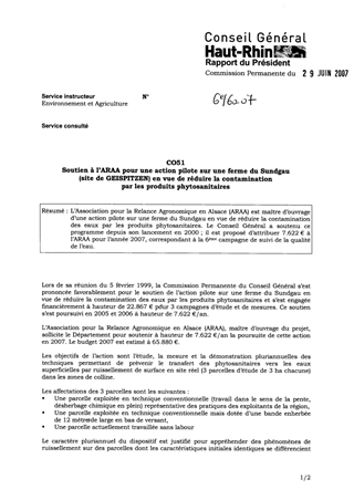 L’Association pour la Relance Agronomique en Alsace (ARAA) est maître d’ouvrage d’une action pilote sur une ferme du Sundgau en vue de réduire la contamination des eaux par les produits phytosanitaires. Le Conseil Général a soutenu ce programme depuis son lancement en 2000 ; il est proposé d’attribuer 7.622 € à l’ARAA pour l’année 2007, correspondant à la 6ème campagne de suivi de la qualité de l’eau.