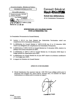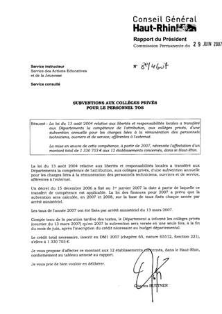 La loi du 13 août 2004 relative aux libertés et responsabilités locales a transféré aux Départements la compétence de l'attribution, aux collèges privés, d'une subvention annuelle pour les charges liées à la rémunération des personnels techniciens, ouvriers et de service, afférentes à l'externat. La mise en œuvre de cette compétence, à partir de 2007, nécessite l'affectation d'un montant total de 1 330 703 € aux 12 établissements concernés, dans le Haut-Rhin.