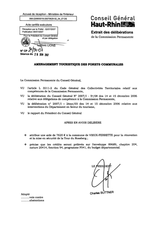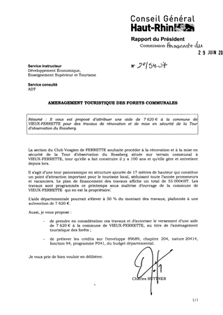Il vous est proposé d’attribuer une aide de 7 620 € à la commune de VIEUX FERRETTE pour des travaux de rénovation et de mise en sécurité de la Tour d’observation du Rossberg.