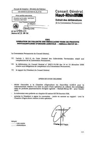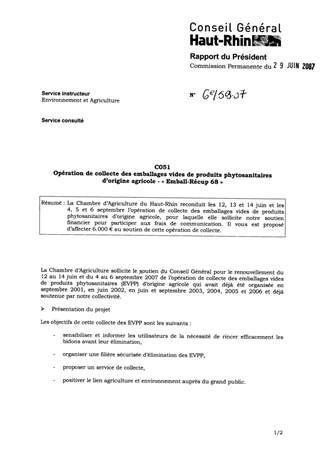 La Chambre d’Agriculture du Haut-Rhin reconduit les 12, 13 et 14 juin et les 4, 5 et 6 septembre l’opération de collecte des emballages vides de produits phytosanitaires d’origine agricole, pour laquelle elle sollicite notre soutien financier pour participer aux frais de communication. Il vous est proposé d’affecter 6.000 € au soutien de cette opération de collecte.