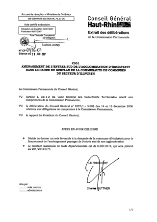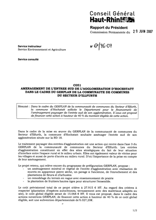 Dans le cadre du GERPLAN de la communauté de communes du Secteur d’Illfurth, la commune d’Hochstatt sollicite le Département pour le financement de l’aménagement paysager de l’entrée sud de son agglomération. Il vous est proposé de financer cette action à hauteur de 40 % du montant éligible de cette action.