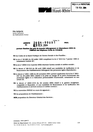 portant fixation des prix de journée hébergement et dépendance 2004 de l'EHPAD des hôpitaux civils de COLMAR. Resumé Pièces jointes ARRETE Assemblée : Non défini Date : 17/02/2004 Rapporteur : Non défini Collectivité : Conseil départemental du Haut-Rhin Direction : Non défini Service : Service de la Tarification des Etablissements Domaine : Prix de Journée Commission :