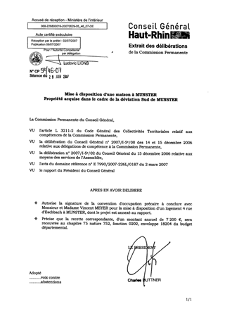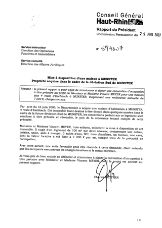 le présent rapport a pour objet de m'autoriser à signer une convention d'occupation à titre précaire au profit de Monsieur et Madame Vincent MEYER pour une maison sise 4 route d'Eschbach à MUNSTER, moyennant une redevance annuelle de 7 200 €, charges en sus.