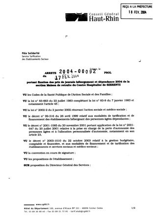 portant fixation des prix de journée hébergement et dépendance 2004 de la section maison de retraite du centre hospitalier de SIERENTZ. Resumé Pièces jointes ARRETE Assemblée : Non défini Date : 17/02/2004 Rapporteur : Non défini Collectivité : Conseil départemental du Haut-Rhin Direction : Non défini Service : Service de la Tarification des Etablissements Domaine : Prix de Journée Commission :