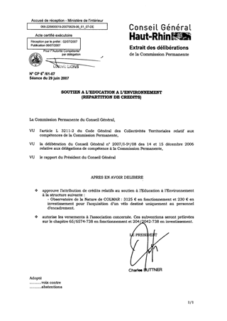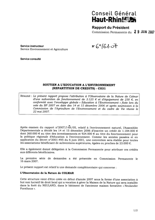 Le présent rapport propose la répartition des crédits de fonctionnement et d’investissement entre les différentes associations, en conformité avec l’enveloppe globale « Education à l’Environnement » fixée lors du vote du BP 2007 en date des 14 et 15 décembre 2006 et après soumission à la Commission de l’Agriculture de l’Environnement et du cadre de Vie réunie le 8 février 2007.