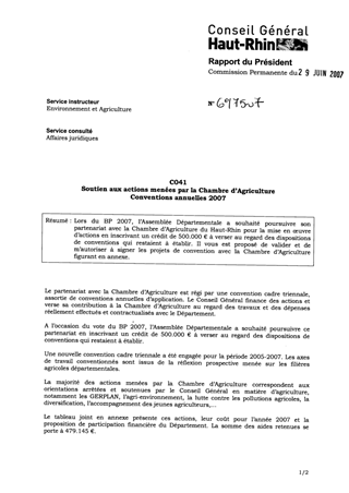 Lors du BP 2007, l’Assemblée Départementale a souhaité poursuivre son partenariat avec la Chambre d’Agriculture du Haut-Rhin pour la mise en œuvre d’actions en inscrivant un crédit de 500.000 € à verser au regard des dispositions de conventions qui restaient à établir. Il vous est proposé de valider et de m’autoriser à signer les projets de convention avec la Chambre d’Agriculture figurant en annexe.