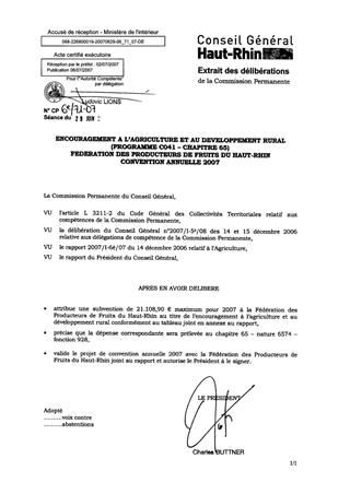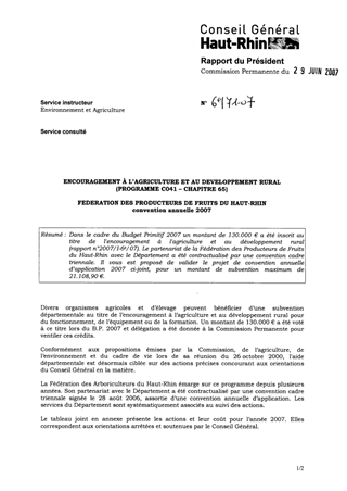 Dans le cadre du Budget Primitif 2007 un montant de 130.000 € a été inscrit au titre de l'encouragement à l'agriculture et au développement rural (rapport n°2007/I 6è/07). Le partenariat de la Fédération des Producteurs de Fruits du Haut-Rhin avec le Département a été contractualisé par une convention cadre triennale. Il vous est proposé de valider le projet de convention annuelle d’application 2007 ci-joint, pour un montant de subvention maximum de 21.108,90 €.