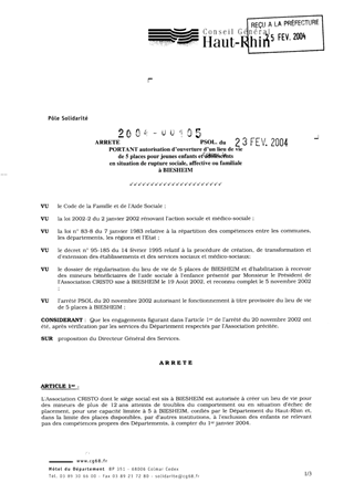portant autorisation d'ouverture d'un lieu de vie de 5 places pour jeunes enfants et adolescents en situation de rupture sociale, affective ou familiale à Biesheim. Resumé Pièces jointes ARRETE Assemblée : Non défini Date : 23/02/2004 Rapporteur : Non défini Collectivité : Conseil départemental du Haut-Rhin Direction : Non défini Service : Direction de la Solidarité Domaine : Autres (non classés) Commission :