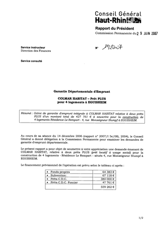 Octroi de garantie d'emprunt intégrale à COLMAR HABITAT relative à deux prêts PLUS d’un montant total de 427 761 € à souscrire pour la construction de 4 logements Résidence Le Rempart - 4, rue Monseigneur Stumpf à EGUISHEIM.