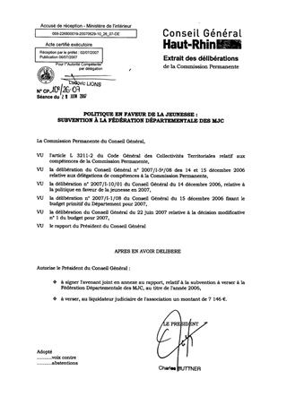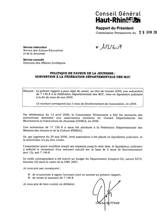 Le présent rapport a pour objet de verser, au titre de l'année 2006, une subvention de 7 146 € à la Fédération Départementale des MJC, mise en liquidation judiciaire à la fin du mois de mai 2006. Ce montant correspond aux 5 mois de fonctionnement de l'association, en 2006.