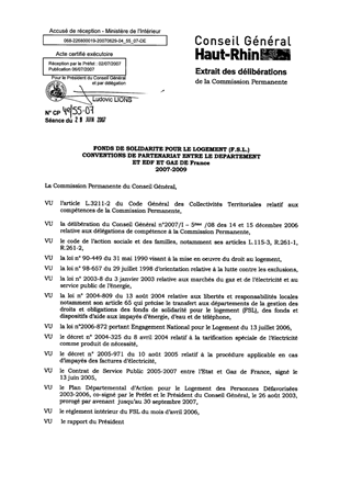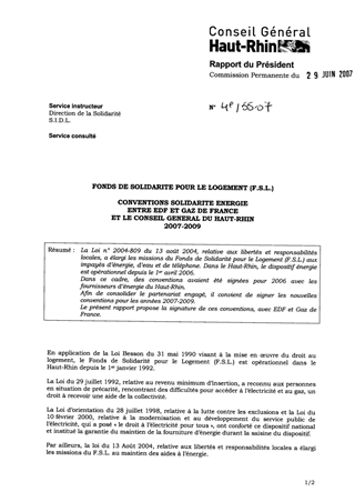Fonds de Solidarité pour le Logement (F.S.L.) - Conventions solidarité énergie entre EDF et Gaz de France et le Conseil Général du Haut-Rhin 2007-2009