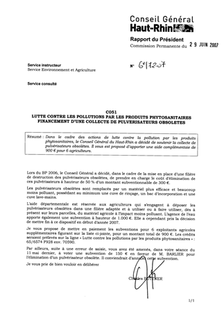 Dans le cadre des actions de lutte contre la pollution par les produits phytosanitaires, le Conseil Général du Haut-Rhin a décidé de soutenir la collecte de pulvérisateurs obsolètes. Il vous est proposé d’apporter une aide complémentaie de 900 € pour 6 agriculteurs.