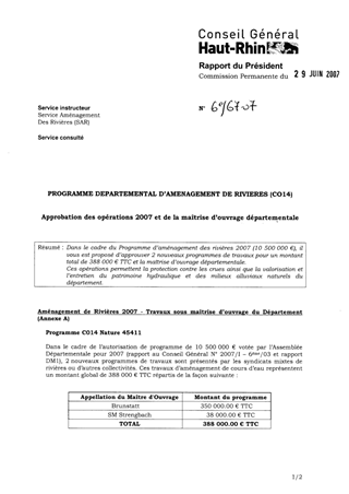 Dans le cadre du Programme d’aménagement des rivières 2007 (10 500 000 €), il vous est proposé d’approuver 2 nouveaux programmes de travaux pour un montant total de 388 000 € TTC et la maîtrise d’ouvrage départementale. Ces opérations permettent la protection contre les crues ainsi que la valorisation et l’entretien du patrimoine hydraulique et des milieux alluviaux naturels du département.